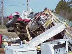 The outbreak began on the 24th, and multiple tornadoes began touching down in Arkansas that evening. An F2 tornado that impacted the towns of Sweet Home and College Station, destroying homes, mobile homes, and a church. The tornado downed many trees and power lines and injured 8 people.[5] Another F2 tornado near Union heavily damaged a dairy barn and the roofs of several homes. Many trees were downed, and three mobile homes were destroyed, resulting in a fatality and three injuries.[6] An F3 tornado touched down near Reed, and moved northeast. Roofs were damaged at several homes. In addition, the tornado rolled a 500-gallon butane tank, damaged or destroyed metal barns and sheds, and knocked down hundreds of trees. Near the town of Kelso, the tornado completely destroyed a metal farm shop, and pieces of debris from the structure were found 6 miles away. Also near the shop, a pickup truck was mangled with several large farm implements thrown, overturned or destroyed. A tractor-trailer was flipped before the tornado dissipated near Snow Lake.[7]