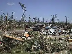 Additionally, an outbreak of 11 tornadoes hit Central Kansas. While most of them were weak, one unexpected F4 tornado struck without a tornado warning being issued. Touching down just outside Hoisington, it tore a two-block-wide path through the north and west sides of town, completely destroying almost 200 homes and businesses and damaging another 230. The roof of the local hospital was partially torn off, and vehicles were tossed and mangled. The tornado caused $43 million in damage. 28 people were injured, and one man was killed by a flying vehicle.[20] This outbreak also included an F2 tornado which heavily damaged two farms, and nine scattered F0 tornadoes.[4]