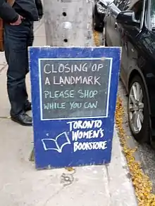 - ↑ Bruce DeMara (9 October 2012). "Toronto Women's Bookstore closing after 39 years". Toronto Star.