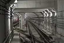 Centre tracks allow a train to enter from either end into a third track, longer than the length of a standard train, between the two service tracks. Trains can either layover or short turn there, allowing other trains to pass them by, or reverse direction from this position with minimal interference with through trains compared to crossovers, which requires the reversal to take place on station platforms. Sometimes, in-service trains are diverted into centre tracks when there is track maintenance on one of the service tracks. Pocket tracks are a variation on the centre track, accessible only from one end. Some storage tracks have a short stub extending beyond the convergence back to the service tracks used to store work cars. All operating centre-track structures (with the exception of Finch West station, which was partially bored and has three fully separate tunnels) were built using the cut-and-cover method, and there are support columns between the tracks. However, at the under-construction Avenue and Laird stations on Line 5 Eglinton, which were "mined" rather than excavated via cut-and-cover, all three tracks are housed within single tubular, columnless tunnels.[4]