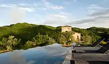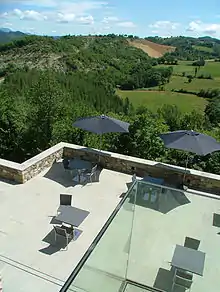 The tower interiors have been restored with a modernistic design approach that complements auxiliary buildings, terraces and pool areas to create a contemporary retreat.[5] The structures are aligned on an axis with the tower to maximize panoramic views over the Carpini valley, a view unchanged since medieval times, and an escape from the modern world.