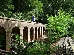 The Torry Hill Railway was built in the 1930, as many British narrow gauge estate railways. It is maintained and occasionally operated by a group of volunteers. There is still a turntable, a 100 ft (30 m) long tunnel and a viaduct that has been built from realistically scaled miniature bricks. It is owned by the heirs of Sir Robert Leigh-Pemberton, Baron Kingsdown.[1]