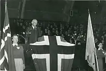 ![]() Torsten Tegnér delivering a speech for Norwegian refugees during the Second World War | |