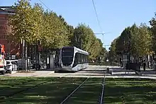 The Toulouse tramway (French: Tramway de Toulouse) is a two-line tram system in Toulouse, Midi-Pyrénées, France, and operates from Toulouse to the suburb of Beauzelle, passing through Blagnac. The Line T1 tramway serves 24 stations, and runs over of a route that is 15 kilometres (9.3 mi) long. Including the three-station, 2.4-kilometre (1.5 mi) branch line of Line T2 which opened in April 2015,[3] the entire Toulouse tramway serves 27 stations[1] and is based on the Alstom Citadis 302 family of low-floor trains.