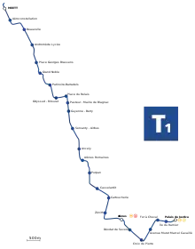 Line T1 originally served 18 stations, and ran over of a route that is 11 kilometres (6.8 mi) long. It was originally planned that the Line T1 tramway would open on 27 November 2010, but industrial action delayed the opening to December 2010.[4]