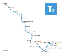 Line T2 was originally a 2.4 km (1.5 mi) branch of line T1 called Line Envol (literally Takeoff) running from Jean Maga roundabout, between stations Ancely and Servanty-Airbus, to the Airport. But before its opening, it was finally commercially dissociate from line T1 and opened on 11 April 2015.[3][8]