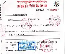 - Overseas travelers will have their Tibet entry letters checked at airports, railway stations, and road checkpoints, and they will be handed over to the group guide for safekeeping after entering Tibet. At the end of the trip, the travel agency will return the letter of entry to the TAR Tourism Bureau for filing, and no letter of admission will be allowed to be taken out of Tibet.[18]