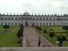 Hazarduari Palace, a tourist attraction, is known to have the second largest chandelier in the world and also the largest staircase in India. This three-storey palace was built in 1837 by Duncan McLeod for Nawab Nazim Humaun Jah, the then Nawab of Bengal. The palace was built in the Indo-European style.[10] It derives its name from the thousand doors in the palace (among which only 900 are real). In 1985, the palace was handed over to the Archaeological Survey of India (ASI) for better preservation.[11][12] The Hazarduari Palace Museum is regarded as the biggest site museum of ASI and has 20 displayed galleries containing 4742 antiquities, 1034 of which are displayed for the public. They include various weapons, oil paintings of Dutch, French and Italian artists, marble statues, rare books, old maps, land revenue records and palanquins (mostly belonging to 18th and 19th centuries). Cooch Behar Palace built in 1887, was designed on the model of Buckingham Palace in London, during the reign of Maharaja Nripendra Narayan.