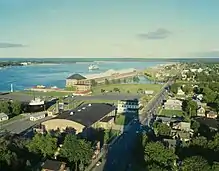 The Tower of History (originally the Tower of Missionaries) is a 210-foot (64 m) observation tower in Sault Ste. Marie, Michigan.[1][2][3] Located at 326 E. Portage Avenue,[1] it was the tallest observation tower in the Upper Peninsula of Michigan when completed in 1968.[4][5][6] The tower was built in a modernist style and consists of three vertical, trapezoid-shaped columns that support five cantilevered observation platforms.[7] It provides a panoramic, 360-degree view of the Soo Locks, the St. Mary's River, Lake Superior, and cities on both the American and Canadian sides of the border.[1][2][8] The view extends for roughly 20 miles (32 km);[6][9] in total, approximately 1,200 square miles (3,100 km2) are visible from the tower.[10]