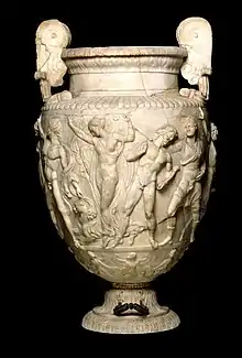 The Townley Vase[1] is a large Roman marble vase of the 2nd century CE, discovered in 1773 by the Scottish antiquarian and dealer in antiquities Gavin Hamilton in excavating a Roman villa[2] at Monte Cagnolo, between Genzano and Civita Lavinia, near the ancient Lanuvium, in Lazio, southeast of Rome.[3] The ovoid vase has volute handles in the manner of a pottery krater. It is carved with a deep frieze in bas-relief, occupying most of the body, illustrating a Bacchanalian procession. Its name comes from the English collector Charles Townley, who purchased it from Hamilton in 1774 for £250. Townley's collection, long on display in his London house in Park Street, was bought for the British Museum after his death in 1805.