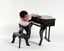 Early toy pianos used glass bars to produce their sound, but Albert Schoenhut, son of a German toy-making family, introduced metal sounding bars to make the instrument more durable.[2] One popular model used metal xylophone bars, struck by a wooden sphere thrown up by the piano key to make its sound. In 1866 he was offered employment in Philadelphia, United States, to repair German toy pianos which had been damaged in transit. In 1872 he established the Schoenhut Piano Company to manufacture toy pianos, diversifying into other instruments.[3] By 1917, Schoenhut produced a catalog showing 10 pages of upright and grand pianos of all shapes and sizes, with one page devoted to miniature piano stools alone. The models had nicknames beginning with "P", such as Packer, Padder, Papa and Poet. Keys were made of imitation ivory. By 1935, Schoenhut had produced over 40 styles and sizes of toy piano, with prices ranging from 50 cents to 25 dollars.[2]