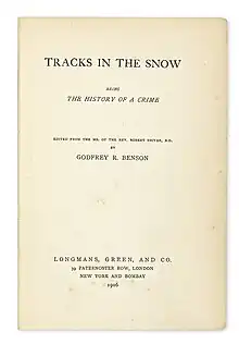 Tracks in the Snow is a 1906 detective novel by the British writer and politician Godfrey Benson.[1] It was his only crime novel, he later became better known for his non-fiction works such as biographies of Abraham Lincoln (1916) and Theodore Roosevelt (1923). A popular success, it was republished in 1928,[2] but it later fell into obscurity. Martin Edwards included it in his list of a hundred classic crime novels and noted "Benson's thoughtful, well-crafted prose, his insights into human behaviour, and the way in which the story touches on issues such as free will and the ramifications of Britain's imperial past combine to make his brief venture into the crime genre notable".[3]