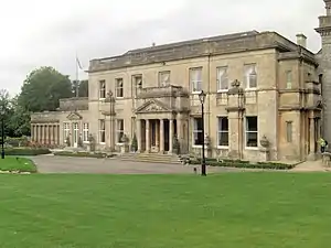 Tracy Park gives its name to the Grade II listed mansion situated within its grounds.[11] The house has a 17th-century nucleus, but has been remodelled externally. Its two-storey western façade of seven bays, in a classical style built of limestone ashlar, dates from circa 1800. The slightly protruding central three bays contain the main entrance which is through a later Doric tetrastyle porch; the tympanum within the porch's pediment contains a lamb and flag motif, while the entablature bears the motto "In hoc signo vinces."[11] Two large pilasters sit between the outer pairs of windows on either side of the facade; perhaps intended to complement the porch, they rise only to the first floor and are crowned with heavy stone crosses. This porch is part of the remodeling of the house by Charles Raikes Davy. On the western facade's left side is a single-story 19th century extension; it has a central door (beneath a pediment) between two windows. Attached to the left is a lower extension, dating to c. 1920, with an arcade of eight Doric columns.[11]