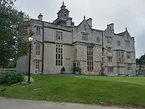 Much of the rear facade of the house was remodeled in the 19th century in a Tudor Gothic style.[3] However, the haphazard fenestration suggesting mezzanine floors, and stonework and the need for a low buttress suggest that the lower floors, at least, may belong to the 16th and 17th centuries. Facing the rear are a number of outbuildings, including the former stables, which date from 1849 to 1860.[3]