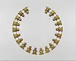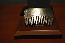 In the pre Hispanic period, metals were used to create needles, punches, tweezers, weapons and musical instrument but its most important uses, especially gold and silver, was as jewelry for the social elite and as offerings to the gods.[2][7][8] Gold and silver were worked by hammering, plating and molds the blending of these and some casting was known.[2][4][9] One pre Hispanic technique was to hammer metal flat, punch out a design and then layer this design over wood or leather, often used on shields.[9] Silver was less used in the pre Hispanic period as it was less valued as tribute. It did not have the same divine symbolic value that gold did.[7] The use of copper was almost exclusive to the Purépecha Empire in what is now Michoacán when the Spanish arrived. Copper instruments included axes, hoes, scythes, punches, chisels, needles, pins, arrowheads, brooches, canes, handles, helmets, shields and small bells.[4]