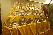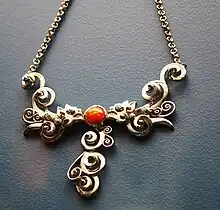 Despite down from its peak in the colonial era, Mexico is still the number one producer of silver in the world.[23] Silver pieces made in Mexico include candelabras, jars, platters, necklaces and buttons for charro outfits.[24] Traditional silver work in Mexico has its origins in the colonial period, as the metal was not particularly prized in the Mesoamerican era.[23][25] Mexican silver from the colonial era to the present can be found in many museum collections around the world.[26] There are still artisans which still make silver pieces in the style of the 17th and 18th centuries. However, these kind of work tends to bring more fame than money.[25] Globalization has affected the design of silver pieces in Mexico as much of it is exported.[26] Most Mexican silver work today is updated designs, a trend that dates from the work of William Spratling in Taxco, making Mexico again a center of export for finished pieces.[23] The tradition continues here, with some schools that teach the trade but most smiths learn through a term of apprenticeship, often as a part of the family business.[27] Taxco has been designated a Pueblo Mágico in part because of its silver work, and it is home to the William Spratling Museum, which has a collection of this silver work.[8]