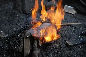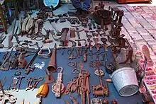 Iron was not worked in the Mesoamerican period, with its mining and working introduced by the Spanish.[31] Exploration of the metal was initially banned to protect the industry in Spain, but as tools made from the metal were essential for exploration and conquest, the prohibition was soon ignored.[12][32] Initially the items were purely utilitarian such as tools, locks, horseshoes and tools.[31][33] Later in the colonial period, iron began to be used in other ways, including decorative elements in churches and mansions such as railings and balconies.[12] The height of traditional Mexican ironworking was in the 17 and 18th centuries.[31]