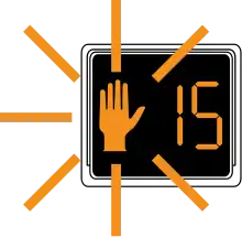 Pedestrian countdown timers are becoming common at urban signal-controlled crossings. Where a pedestrian countdown is shown, it is normally used in conjunction with the flashing hand signal (in the US and Canada) or blackout period (UK), showing the amount of time remaining in seconds until the end of the flashing hand or blackout.[21][42] Pedestrian countdown timers do not significantly increase or reduce the number of red- and amber-light running drivers. Studies have found that pedestrian countdown timers do significantly improve pedestrian compliance over traditional pedestrian signals; however, results are mixed.[42][43]