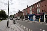 The Village was almost completely self-contained, with its own shops, public hall, post office, police station, school, social club, and sports facilities.[78] Three corrugated iron churches were built: a Methodist chapel in 1901, St Cuthberts (Church of England) in 1902, and the Roman Catholic St Antony's in 1904.[76] St Cuthbert's was subsequently replaced by a brick building, but closed in 1982.[79] Only St Antony's remains open; it contains the altar and a stained glass window from the chapel at Trafford Hall, donated by Lady Annette de Trafford.[80] The Village's design attracted criticism from the start; the streets were narrow, with few gardens, and the whole development was close to the pollution of the neighbouring industries. In that respect it resembled the terraced properties in the surrounding areas, many of which were condemned as slums in later years. By the 1970s The Village was also considered by Stretford Council to be a slum area, and unsuitable for residential housing. In the first phase of clearance, during the mid-1970s, 298 houses were demolished. A further 325 houses were demolished in the early 1980s, leaving only the largest 84 houses remaining.[81]