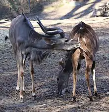 It is only during the breeding season males congregate around a female in estrus for a few hours.[26][1][4] All spiral-horned antelope species are polyandrous. Aggression is very low among individuals of both sexes though intraspecific competition does occur. In females often they neck-fight as well poke and snap at each other.[26] Males would use their horns for wrestling where they try to attack the face.[26] Sometimes there is even intimation from the males to persuade the female into submission as often she would try and retaliate.[26] The gestation period occurs once the female has been inseminated from the male successfully. In most species it lasts approximately seven months, although in the larger species this extends to eight or nine months.[26][4] They only give birth to a single calf. Once the young are born, they will not wean until they are around five to six months of age.[4] Females sexually mature by two to three years while for males it is four to five years.[4]