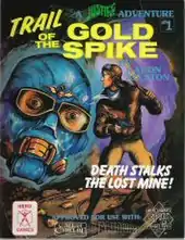 Trail of the Gold Spike is an adventure in which the player characters oppose the evil Condor as he tries to ruin the Whitley family and their mining business.[1] Though written for Justice, Inc. , it was also "approved for use with" and included statistics for Chill, Call of Cthulhu and Daredevils.