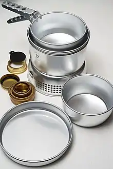 Trangia is a line of alcohol-burning portable stoves manufactured by Swedish company Trangia AB in Trångsviken. These stoves are designed primarily for backpackers, with a focus on light weight, durability and simple design. The company began in 1925,[1] selling cookware. The Trangia stove was developed by 1951.[1] Trangia stoves were initially preferred to kerosene (paraffin) pressure stoves because they required only one type of fuel (alcohol, usually in the form of cheaper but deliberately poisonous methylated spirit).[2] Trangia's selling point is that the entire packaged stove, including pots, is not significantly larger than a standard camp cooking pot. For this reason the Trangia has retained much of its popularity despite the development of alternative stove fuels and designs.
