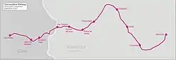 The line followed roughly the ancient route taken by travellers and mule-trains crossing the Andes between Chile and Argentina and connected the broad gauge, 5 ft 6 in (1,676 mm), railway networks of the two countries, rising to a height of almost 3,200 metres at Las Cuevas where the track entered the Cumbre tunnel, about 3.2 km long, on the international border. Nine sections of rack were laid in the last 40 km of track on the Argentine approach to the tunnel, ranging from 1.2 km to 4.8 km in length,[5] with a maximum gradient of 1 in 17 (5.88%). On the Chilean side there were seven sections of rack in just 24 km, of which one section was 16 km long with an average gradient of 1 in 13 (7.69%). Sections of the line were protected by snowsheds and tunnels.