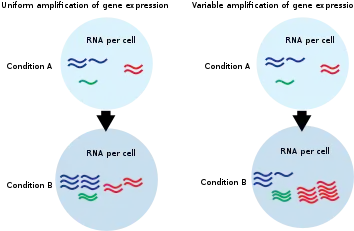 Commonly used gene expression experiments interrogate the expression of one gene (qPCR) or many genes (microarray, RNA-Seq). These techniques generally measure relative mRNA levels and employ normalization methods that assume only a small number of genes show altered expression.[5] In contrast, single cell or cell-count normalized absolute measurements of mRNA abundance are required to reveal transcriptional amplification.[6] Additionally, global measurements of mRNA or total mRNA per cell can also uncover evidence for transcriptional amplification.[7][8]