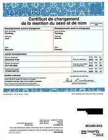 To qualify to change legal gender, the person concerned by the application must be domiciled in Québec for at least one year. If the person concerned by the application was born in Québec but lives elsewhere, the person may also qualify to change the sex designation if the person shows that such an amendment is not possible in the province or country in which the person is domiciled.[61] They may make application to the Directeur de l'etat civil for a Certificate of Change of Mention of Sex (certificat de changement de la mention du sexe), regardless of their place of birth; however, this is solely limited to a male or female sex designation, forbidding the use of a non-binary gender designator.[62] They may also apply for a combination Certificate of Change of Mention of Sex and Name (certificat de changement de la mention du sexe et de nom). After such a certificate is issued, one's gender may be amended on a Québec birth certificate. If one was born outside Québec, the birth certificate will be designated a semi-authentic act pursuant to Article 137 of the Civil Code.[63]