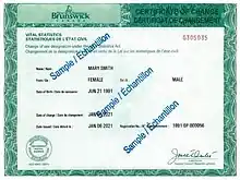 In April 2017, a bill passed the Legislative Assembly of New Brunswick to add gender identity or expression to the human rights laws and to allow gender changes without the required surgery.[36] A person born in New Brunswick or ordinarily resident there for at least three months may make application to Service New Brunswick for a change of their legal gender.[37]