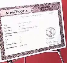 Therefore, a change of sex indicator is now available in Nova Scotia for persons born there or those who have been ordinarily resident at least three months in the province.[5] Nova Scotia also offers the option of no gender being displayed on one's driver's licence and/or identification card.[52]