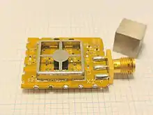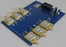 The Radio Frequency (RF) front ends receive the radio signals from each antenna. The RF front ends take advantage of low-cost, widely available, and very sensitive integrated circuits developed for global positioning satellite receivers. The TART uses the MAX2769C Universal GNSS Receiver[2] made by Maxim Integrated. This single integrated circuit includes all the elements required of a radio-telescope receiver; low-noise amplifier, local oscillator, mixer, filters and an ADC. Each RF front end generates a data-stream of digitized radio signals with 2.5 MHz bandwidth from the GPS L1 band (1.57542 GHz).