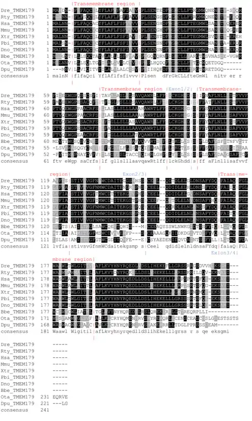 - ↑ "AceView: Gene:TMEM179, a comprehensive annotation of human, mouse and worm genes with mRNAs or ESTsAceView". www.ncbi.nlm.nih.gov. Retrieved 2019-02-26.