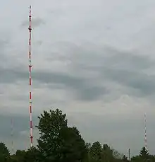 - Guyed steel tube mast for FM and TV, built in 1960. This radio mast has a diameter of 2 metres. It was 255 metres high in 1960 and grew to 300 metres in the meantime.
