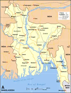 Since the 1980s, the Indian and Bangladeshi governments have sought to negotiate an agreement permitting commercial vehicles to pass through Bangladeshi highways to reach the northeastern states of India from the west; a concept described in India as the "Bangla Corridor."[3] Such an arrangement is being promoted for its benefit to bilateral commerce, the transport cost reduction for Indian businesses and additional revenue for Bangladesh.[2][4] In 2006, both governments began working on a proposal to provide a bus service directly connecting Kolkata with Agartala, the capital of the Indian state of Tripura, which borders eastern Bangladesh.[5] As of 2007, travelling distance through Indian territory is an estimated 1,700 km (1,056 mi), but a direct road link via Dhaka would shorten the travelling distance to an estimated 400 km (249 mi),[3] considerably reducing the costs of transport for Indian businesses, which have to transport goods and services through the narrow "Chicken's Neck" territory that is bordered by northern Bangladesh and southern Nepal. However, such an arrangement has been politically sensitive in Bangladesh.[3]