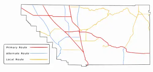 Kern County is served by a large network of highways, expressways and freeways. It is easier to break the network down into three categories: primary, alternate, and local. It is also easier to view Bakersfield as the center of the transportation network, and the routes traveling away from that point. They are listed below, with the names either officially designated by the state, or commonly used by local authorities and Caltrans.