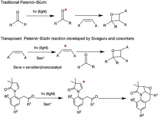 - ↑ Kumarasamy, Elango; Raghunathan, Ramya; Kandappa, Sunil Kumar; Sreenithya, A.; Jockusch, Steffen; Sunoj, Raghavan B; Sivaguru, J. (2017-01-18). "Transposed Paternò–Büchi Reaction". Journal of the American Chemical Society. 139 (2): 655–662. doi:10.1021/jacs.6b05936. ISSN 0002-7863. PMID 27958726.
