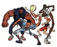 - Crazy Legs[2]—can extend his legs to great length and is superhumanly agile with tremendous leg strength. Possessed of a strategic mind, he is the nearest that the group has to any brains. Current whereabouts are unknown.
