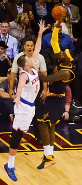 Wear thought he had a chance to be selected in the second round of the 2014 NBA draft, but he went undrafted.[7] He played for the Atlanta Hawks in the 2014 NBA Summer League,[8] and was signed by the New York Knicks on September 9, 2014.[9] The Knicks' roster already had 15 players with guaranteed contracts, and Wear was a longshot to make the team.[7] However, they opened a roster spot for Wear by trading Travis Outlaw. Knicks president Phil Jackson said Wear was "overshadowed at UCLA but has the skill set to play every position from 1 to 4." He added that the team planned to have Wear play in the NBA Development League, "where his possible NBA future solely depends on his ability to learn how to defend."[10] The Knicks lost their 2014–15 season opener in a 104–80 blowout to the Chicago Bulls, but Wear made his pro debut in the fourth quarter with the game already decided.[11] The following night against the Cleveland Cavaliers, he played 13 minutes in a 95–90 win, and held LeBron James to 0-for-4 shooting when he was the primary defender on James.[12]