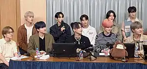 The ten-piece reunited with the Black Clover franchise for its theatrical soundtrack, with "Here I Stand".[80] It became their first number one hit on the Billboard Japan Hot 100,[81] and first platinum certification awarded by the RIAJ ensued from its integration into their Japanese single album of the same title.[82] Its certification was attained five days following its release on March 29, 2023,[82] and placed second on the Oricon Weekly chart with 235,347 copies sold,[83] generating ¥464.4 million ($3.51 million) in five days.[84] The band toured for two months across five cities of Japan for a nationwide fan meeting until its completion on November 12, 2023.[85] It resulted them to visit an audience of half a million attendees across all stages since the outset of the year,[86] and steered the band to become the first Korean act to enter Tokyo Dome for a fan meeting.[87]