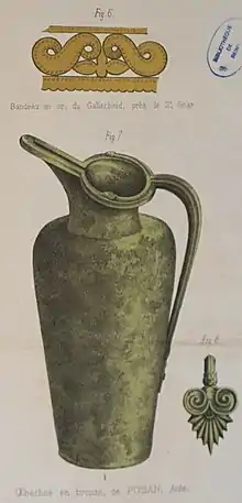 In the last century, professional historians Thomas Hodgkin[5] and later J.B. Bury[6] have generally expressed their scepticism over this identification. Other chance finds scattered over the area of Pouan and its neighboring village Villette— including two small bronze vases, a cup, a gilt-bronze ewer, blades and horse-trappings— support the local perception[7] that these fields are the Catalaunian fields of the decisive battle in 451, usually identified with Châlons-en-Champagne.