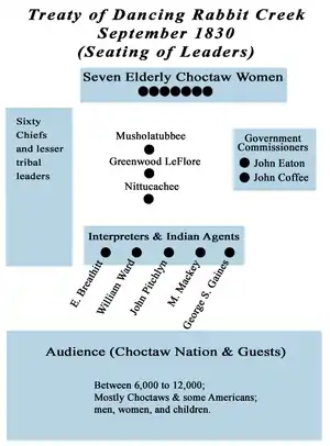 The commissioners met with the chiefs and headmen on September 15, 1830, at Dancing Rabbit Creek.[5] In a carnival-like atmosphere, the US officials explained the policy of removal through interpreters to an audience of 6,000 men, women and children.[5] The Choctaws faced migration west of the Mississippi River or submitting to U.S. and state law as citizens.[5] The treaty would sign away the remaining traditional homeland to the United States; however, a provision in the treaty made removal more acceptable.