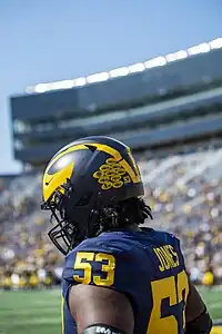 In Jones first four seasons he appeared in 26 games with eight starts.[5] Jones made his first career start in the 2022 season opener versus Colorado State.[6] In week 13 of the 2023 season, after starter Zak Zinter went down with an injury versus rivals Ohio State, Jones took over as the team's starting right tackle.[7] Jones started in the 2024 Rose Bowl and the 2024 College Football Playoff National Championship for the Wolverines.[8] Jones helped the Wolverines win the 2023 national championship.[9]