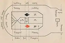 Two croupiers sit on each side of the table, one of them being the dealer; behind the two on the side opposite to the dealer a supervisor of the game has his seat. Six packs of fifty-two cards each are used; these are well shuffled, and the croupier asks any of the players to cut, handing him a blank card with which to divide the mixed packs. The game consists of the dealer dealing two rows of cards face up, the first (upper) row called noir and the second (lower) row called rouge. There are only four bets in trente et quarante: rouge and noir, known as the grand tableau, and couleur and inverse, known as the petit tableau.[9] Rouge and noir bets are concerned with which row wins, and the couleur and inverse bets with whether the first card in the winning row is the same (couleur) or opposite (inverse) to the color of the row.