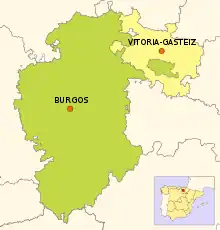 Geographically, the enclave is situated inside the Province of Álava, which completely surrounds it. However, administratively, it belongs to the Province of Burgos.[4] The territory is near the large Basque city of Vitoria-Gasteiz, with over 250,000 inhabitants, while the nearest urban center in Burgos province is Miranda de Ebro, with about 40,000 inhabitants. The enclave holds cultural, commercial and linguistic links with the neighbouring Álava province.[5] According to a Burgos newspaper, in a legal sense there is no territorial dispute, since Treviño's status as part of Castile and León is long established.[6] However, Treviño has been subject to heated political dispute during the last decades, including legal litigation at the highest level.