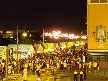 Between 21 and 26 July, the Velá de Santa Ana (literally, "Saint Anne's evenings", because Saint Anne's day on the liturgical calendar is the 26 July) is celebrated on Betis Street. It is the city's second most important festival after the Feria de abril de Sevilla, although it is much older, dating from the 13th century.[12] Here people drink sherry wine and dance the sevillanas, a type of folk dance; eating roasted sardines is also a popular activity. The cucaña is a popular competition during this celebration: people try to take a prize from the top of a greasy pole over the river.