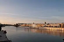 The first settlements in the Triana area are dated from the Roman period.[2] During Muslim rule the neighborhood developed around a castle built in the 10th century. Triana was the last defence of Seville from the west before the city-walls. It was strategically important because of its position between Seville proper and both the coast and the Aljarafe region of grainfields, vineyards, and olive orchards. The construction of a pontoon bridge (puente de barcas, literally, boat-bridge) joining Triana and Seville in 1171 during the reign of Caliph Abu Yaqub Yusuf greatly facilitated the development of the neighborhood. Because of Triana's strategic role in the defence of city, Ferdinand III of Castile destroyed the citadel (Castillo de Triana) and the bridge before taking Seville in 1248.