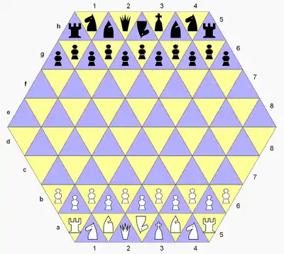 The starting setup is as shown. As in chess, White moves first, and the object is checkmate. Other standard conventions apply as well, including castling, the pawn's initial two-step move, the en passant capture, and promotion at the last rank. The triangular geometry, however, implies special move patterns for the pieces.