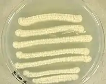 Trichosporon asteroides grows in a range of media including in the presence of the antifungal agent, cycloheximide.[4] Colonies of T. asteroides grown on Sabouraud agar appear white with a brain-like texture, reaching a diameter of 10 mm after 10 days growth at 25 °C (77 °F).[3][6] Colonies have a radially furrowed outer zone and matt appearance that is not powdery like the related species, T. asahii.[3] Antibodies produced by infected patients can also be used to differentiate T. asahii and T. asteroides in disease.[11] Weak growth is seen at 37 °C (99 °F) but is absent at higher temperatures.[6][12] T. asteroides can be distinguished from related Trichosporon species by its ability to utilize D-galactose, L-rhamnose, erythritol and L-arabinitol.[3]