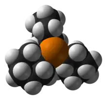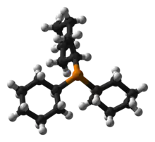 Tricyclohexylphosphine is the tertiary phosphine with the formula P(C6H11)3. Commonly used as a ligand in organometallic chemistry, it is often abbreviated to PCy3, where Cy stands for cyclohexyl. It is characterized by both high basicity (pKa = 9.7)[1] and a large ligand cone angle (170°).[2][3]